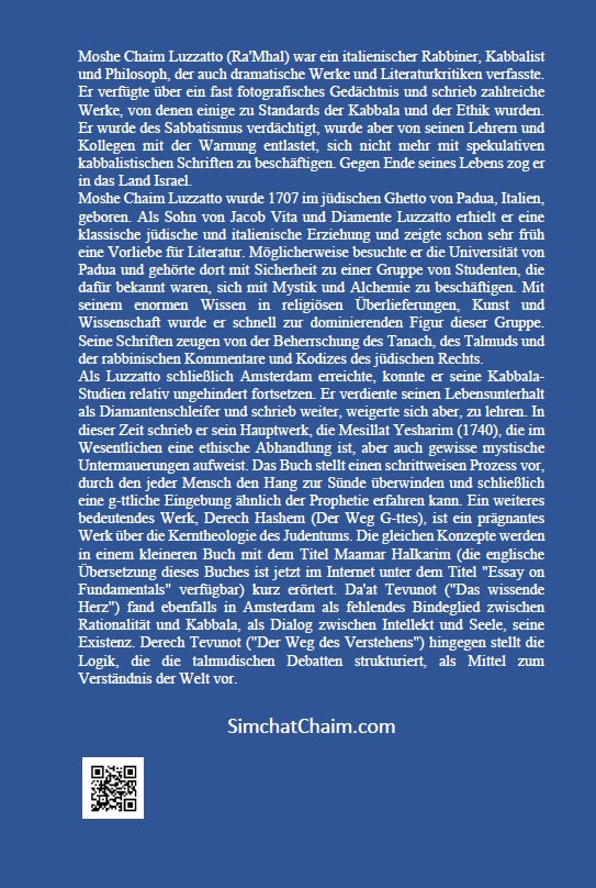 Moshe Chaim Luzzatto (Ra'Mhal) war ein italienischer Rabbiner, Kabbalist und Philosoph, der auch dramatische Werke und Literaturkritiken verfasste. Er verfügte über ein fast fotografisches Gedächtnis und schrieb zahlreiche Werke, von denen einige zu Standards der Kabbala und der Ethik wurden. Er wurde des Sabbatismus verdächtigt, wurde aber von seinen Lehrern und Kollegen mit der Warnung entlastet, sich nicht mehr mit spekulativen kabbalistischen Schriften zu beschäftigen. Gegen Ende seines Lebens zog er in das Land Israel. Moshe Chaim Luzzatto wurde 1707 im jüdischen Ghetto von Padua, Italien, geboren. Als Sohn von Jacob Vita und Diamente Luzzatto erhielt er eine klassische jüdische und italienische Erziehung und zeigte schon sehr früh eine Vorliebe für Literatur. Möglicherweise besuchte er die Universität von Padua und gehörte dort mit Sicherheit zu einer Gruppe von Studenten, die dafür bekannt waren, sich mit Mystik und Alchemie zu beschäftigen. Mit seinem enormen Wissen in religiösen Überlieferungen, Kunst und Wissenschaft wurde er schnell zur dominierenden Figur dieser Gruppe. Seine Schriften zeugen von der Beherrschung des Tanach, des Talmuds und der rabbinischen Kommentare und Kodizes des jüdischen Rechts. Als Luzzatto schließlich Amsterdam erreichte, konnte er seine KabbalaStudien relativ ungehindert fortsetzen. Er verdiente seinen Lebensunterhalt als Diamantenschleifer und schrieb weiter, weigerte sich aber, zu lehren. In dieser Zeit schrieb er sein Hauptwerk, die Mesillat Yesharim (1740), die im Wesentlichen eine ethische Abhandlung ist, aber auch gewisse mystische Untermauerungen aufweist. Das Buch stellt einen schrittweisen Prozess vor, durch den jeder Mensch den Hang zur Sünde überwinden und schließlich eine g-ttliche Eingebung ähnlich der Prophetie erfahren kann. Ein weiteres bedeutendes Werk, Derech Hashem (Der Weg G-ttes), ist ein prägnantes Werk über die Kerntheologie des Judentums. Die gleichen Konzepte werden in einem kleineren Buch mit dem Titel Maamar HaIkarim (die englische Übersetzung dieses Buches ist jetzt im Internet unter dem Titel "Essay on Fundamentals" verfügbar) kurz erörtert. Da'at Tevunot ("Das wissende Herz") fand ebenfalls in Amsterdam als fehlendes Bindeglied zwischen Rationalität und Kabbala, als Dialog zwischen Intellekt und Seele, seine Existenz. Derech Tevunot ("Der Weg des Verstehens") hingegen stellt die Logik, die die talmudischen Debatten strukturiert, als Mittel zum Verständnis der Welt vor.