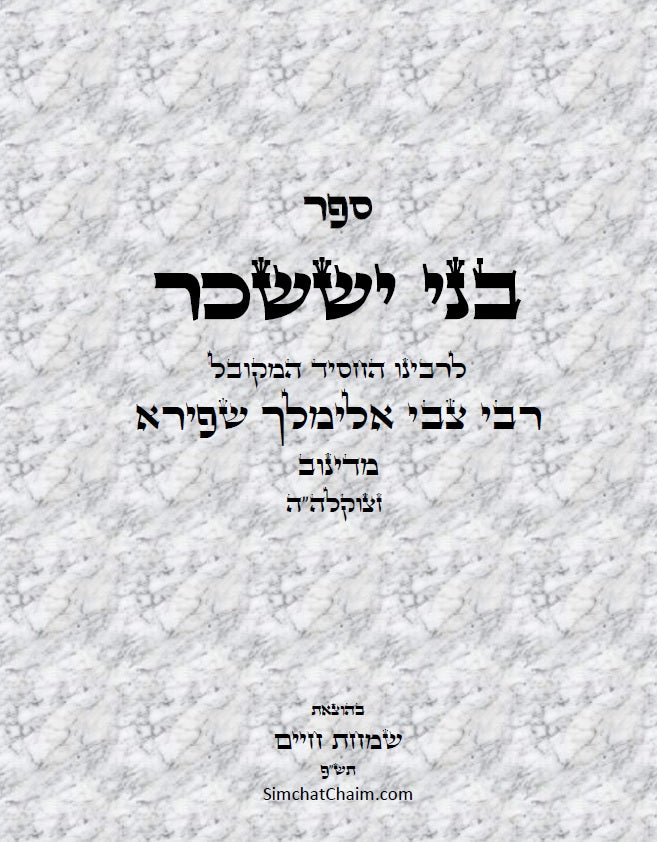 בני יששכר הוא חיבורו המרכזי של רבי צבי אלימלך שפירא מדינוב שעל שם ספרו זה כונה עוד בחייו "בעל הבני יששכר".דרושי הספר מסודרים לפי שנים עשר חודשי השנה היהודית, בהתמקדות מיוחדת על חגי ומועדי ישראל. בשל סידורו הייחודי, הפך הספר לקלסיקה חסידית עיקרית, המסדרת את משנת החסידות על המועדים.שמו של הספר "בני יששכר" כפי שמעיד המחבר בפתח הקדמתו, מיוסד על הפסוק בספר דברי הימים א', פרק י"ב, פסוק ל"ג "וּמִבְּנֵי יִשָּׂשׂכָר יוֹדְעֵי בִינָה לָעִתִּים לָדַעַת מַה יַּעֲשֶׂה יִשְׂרָאֵל", כשההדגשה היא על המשך הפסוק יודעי בינה לעיתים, כמטרת הספר המיועד לעסוק בעיתים ובזמנים.בקרב בני משפחתו ותלמידיו, מקובל טעם נוסף לקריאת שם הספר, וזאת משום שרבי צבי אלימלך קיבל מרבו החוזה מלובלין שאמר לו ברוח הקודש כי הוא בן לשבט יששכר.הספר מיוסד במאמרים מיוחדים על סדר כל חודשי השנה, כאשר בכל חודש מוקדשים מאמרים אחדים לבאר את מהות החודש, את סיבת שמו, ואת משמעותו הקבלית. בפתיחת הספר מוקדשים עשרה 'מאמרי השבתות' העוסקים בדרוש ובהבנה פנימית של מהות השבת, והדרך לעבודת ה' בה. אחריהם באים מאמרי חודש ניסן שהוא החודש הראשון על פי הלוח העברי, ובו דן המחבר בדרושים ארוכים על משמעות חג הפסח וכך על כל סדר המועדים.אריכות דברים מיוחדת, נרשמת במאמרי חודשי כסלו-טבת המוקדשים ברובם למשמעותו של חג החנוכה. וזאת משום שכפי המקובל, בחג זה, חש המחבר התעלות רוחנית מיוחדת. המאמרים שמקיפים את כל ענייני החג שמעט נכתב אודותיו, הפכו את הספר לפופולרי בקרב הציבור החסידי, המרבה ללמוד בו בעיקר בימים אלו. הרב המקובל רבי צבי אלימלך שפירא (הרצ"א) נולד בשנת תקמ"ג בעיירה יאוורניק שבגליציה (כיום בפולין) לאביו רבי פסח לנגזם, מלמד תינוקות, ולאימו איטה, אחייניתם של רבי אלימלך מליז'נסק ורבי משולם זושא מאניפולי. מסופר כי כל אחיו הגדולים של רבי צבי אלימלך נפטרו בגיל צעיר, וכדי למנוע את פטירתו של רבי צבי אלימלך, התייעצה אימו עם דודה, רבי אלימלך מליז'נסק, לגבי מתן שם לרך הנולד. רבי אלימלך הבטיח לה שיולד לה בן זכר שיחיה ויאיר את העולם בתורתו, והורה לה לקרוא לילד בשמו שלו, אלימלך. מאחר שבארצות אירופה לא מקובל לתת לילד שם של אדם חי, הוסיפו הוריו לשמו של התינוק את השם צבי. רבי אלימלך אמר שבגלל זה הפסידו חצי ממעלתו של התינוק, משום ש"צבי" אינו מלך, ולכן יהיה חצי מלך.את תורתו למד רבי צבי אלימלך אצל החוזה מלובלין ורבי מנחם מנדל מרימנוב, וכן אצל המגיד מקוז'ניץ ורבי אברהם יהושע העשל מאפטא. כמו כן היה בקשר עם תלמידי החוזה מלובלין ובעיקר רבי נפתלי צבי מרופשיץ ורבי צבי הירש מזידיטשוב.שימש ברבנות ברוביטש, בסטריז'וב, בהאליטש, בדינוב ובמונקאטש, ובהן פעל רבות להפצת תורת הקבלה ונלחם בחריפות נגד המשכילים. בזמן כהונתו במונקאטש אסר על פיטום אווזים משום צער בעלי חיים, ולכן עורר עליו את חמתם של פרנסי העיר ונאלץ לעזוב את מונקאטש ולחזור לדינוב, ונקרא על שמה. נהג לחתום על מכתביו בחתימה "האוהב הנאמן לכל ישראל, דורש טוב לעמו". בדינוב חסידים החלו להתקבץ סביבו. נפטר בדינוב בי"ח בטבת תר"א, בגיל 58. בנו רבי דוד מילא את מקומו כאדמו"ר בדינוב