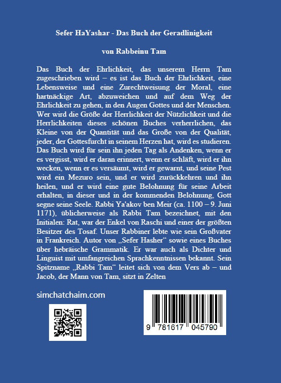 Das Buch der Ehrlichkeit, das unserem Herrn Tam zugeschrieben wird – es ist das Buch der Ehrlichkeit, eine Lebensweise und eine Zurechtweisung der Moral, eine hartnäckige Art, abzuweichen und auf dem Weg der Ehrlichkeit zu gehen, in den Augen Gottes und der Menschen. Wer wird die Größe der Herrlichkeit der Nützlichkeit und die Herrlichkeiten dieses schönen Buches verherrlichen, das Kleine von der Quantität und das Große von der Qualität, jeder, der Gottesfurcht in seinem Herzen hat, wird es studieren. Das Buch wird für sein ihn jeden Tag als Andenken, wenn er es vergisst, wird er daran erinnert, wenn er schläft, wird er ihn wecken, wenn er es versäumt, wird er gewarnt, und seine Pest wird ein Mezuro sein, und er wird zurückkehren und ihn heilen, und er wird eine gute Belohnung für seine Arbeit erhalten, in dieser und in der kommenden Belohnung, Gott segne seine Seele. Rabbi Ya'akov ben Meir (ca. 1100 – 9. Juni 1171), üblicherweise als Rabbi Tam bezeichnet, mit den Initialen: Rat, war der Enkel von Raschi und einer der größten Besitzer des Tosaf. Unser Rabbiner lebte wie sein Großvater in Frankreich. Autor von „Sefer Hasher“ sowie eines Buches über hebräische Grammatik. Er war auch als Dichter und Linguist mit umfangreichen Sprachkenntnissen bekannt. Sein Spitzname „Rabbi Tam“ leitet sich von dem Vers ab – und Jacob, der Mann von Tam, sitzt in Zelten.